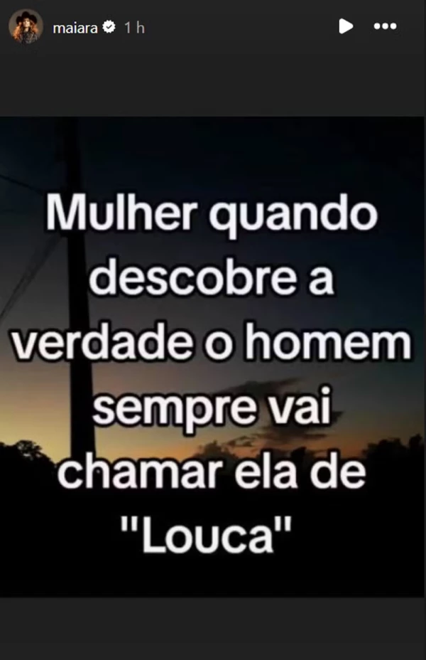 Na postagem, a cantora sertaneja compartilhou uma mensagem que aborda diretamente o tema da infidelidade. O texto sugere uma análise sobre a reação masculina quando mulheres descobrem a verdade em um relacionamento, trazendo a seguinte frase: “Mulher quando descobre a verdade, o homem sempre vai chamar ela de louca”.