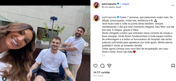 Patrícia escreveu que Felipe enfrentou vários deslocamentos de avião durante o tratamento, sempre mentalizando o momento da alta. “Chegou, graças a Deus. Muito obrigada a todos que entraram nessa corrente de oração e boas energias“, disse a apresentadora.