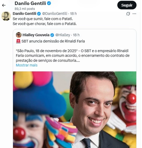 Danilo Gentili também se manifestou sobre o episódio. Em publicação nas redes sociais, escreveu: “Se você quer sumir, fale com o Patati. Se você quer chorar, fale com o Patatá.” A frase curta repercutiu e foi interpretada como uma provocação ao ex-empresário da dupla. As manifestações de Ratinho, Liminha e Gentili mostraram que a saída de Rinaldi Faria foi recebida com diferentes formas de expressão dentro da emissora. O episódio evidenciou os impactos da decisão nos bastidores e reforçou a relevância do momento para o SBT.