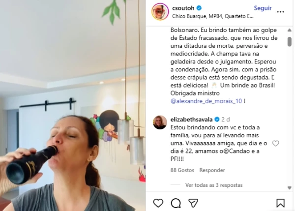 A repercussão da prisão preventiva do ex-presidente Jair Bolsonaro deu o que falar nas redes sociais. A autora de novelas da Globo, Claudia Souto, celebrou o momento abrindo uma garrafa de champagne. Mas quem chamou grande atenção nos comentários foi a atriz Elizabeth Savala, que fez questão de manifestar entusiasmo e apoio à roteirista, transformando sua reação em um dos destaques da publicação.
