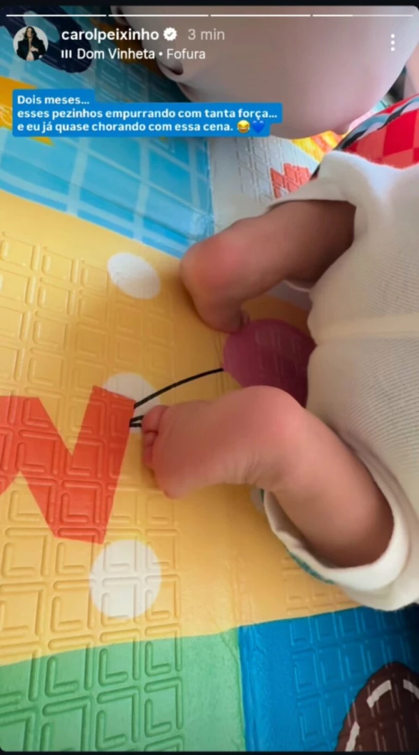 No Instagram, a influenciadora contou que Bento tem demonstrado força e curiosidade típicas dessa fase inicial da infância. Em tom bem-humorado e sensível, Carol escreveu: “Dois meses… esses pezinhos empurrando com tanta força… e eu já quase chorando com essa cena”. A postagem recebeu inúmeros comentários de carinho dos fãs, que acompanham cada etapa da maternidade da artista.