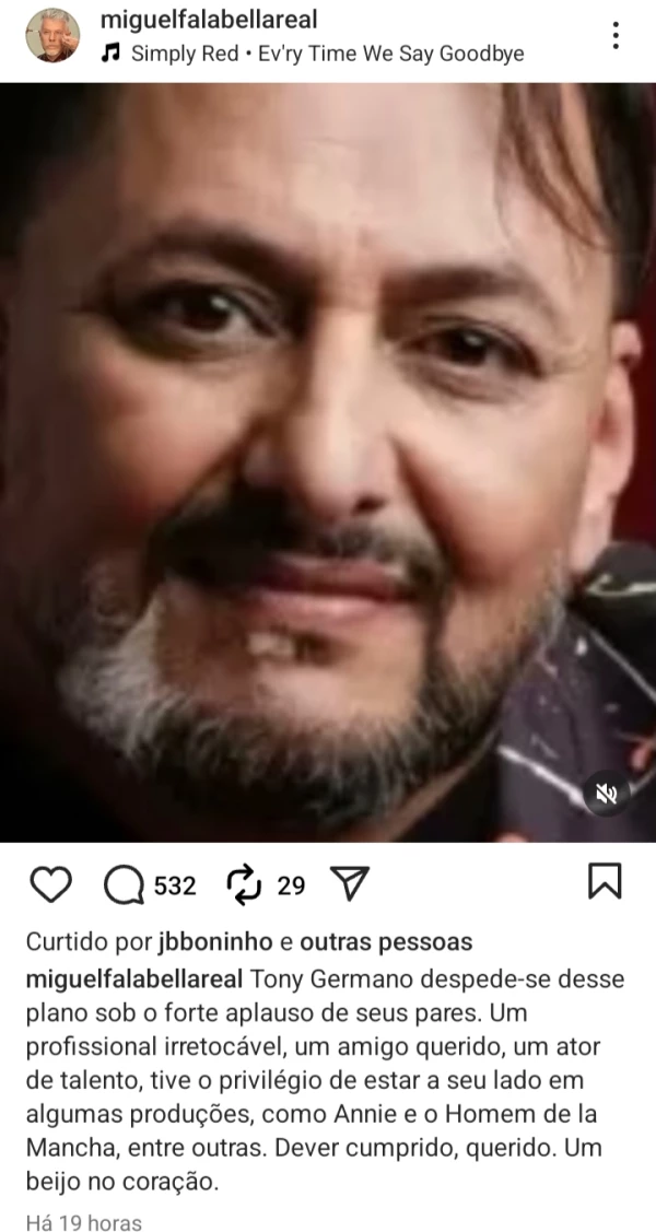 Entre os famosos que lamentaram o falecimento de Tony Germano, Miguel Falabella foi um dos primeiros a se manifestar, dedicando um texto emocionante ao amigo e ressaltando sua parceria em produções importantes do teatro musical. “Um profissional irretocável, um amigo querido, um ator de talento, tive o privilégio de estar a seu lado em algumas produções, como Annie e o Homem de la Mancha, entre outras. Dever cumprido, querido”, escreveu o diretor e ator, que destacou a saudade deixada por Tony.