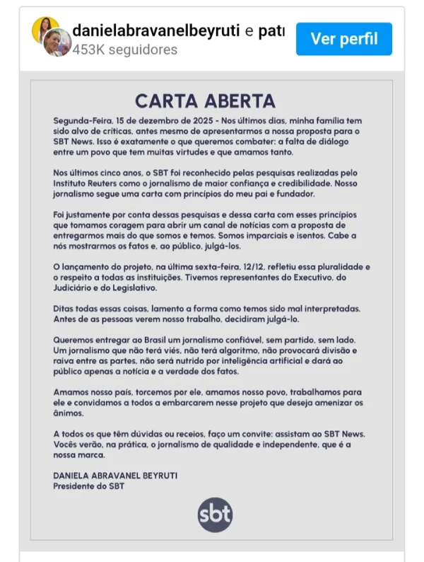 Na carta, Patrícia e Daniela lembraram ainda que autoridades ligadas à direita, como o governador Tarcísio de Freitas e o prefeito Ricardo Nunes, também participaram da inauguração. “Queremos entregar ao Brasil um jornalismo confiável, sem partido, sem lado”, reforçaram. O posicionamento foi visto como uma resposta direta às acusações de Zezé e reacendeu o debate sobre o papel editorial do SBT sob a nova gestão.