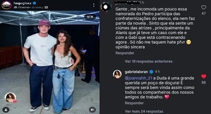 A usuária ainda mencionou outras atrizes da novela, incluindo Alanis Guillen, com quem Pedro já teve um relacionamento fora da ficção, além da própria Gabriela Loran. A insinuação sugeria um clima de disputa feminina, o que rapidamente repercutiu entre fãs da novela e seguidores dos envolvidos.