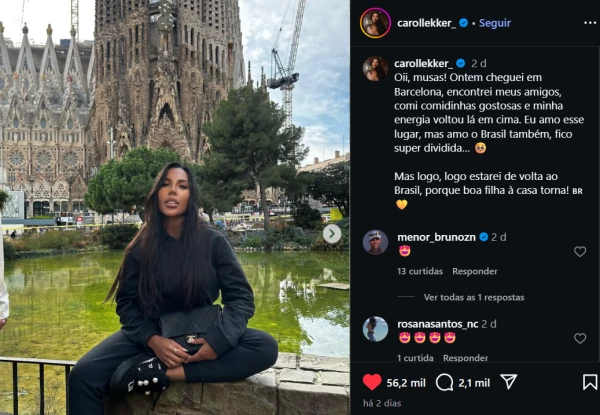 “Oii, musas! Ontem cheguei em Barcelona, encontrei meus amigos, comi comidinhas gostosas e minha energia voltou lá em cima. Eu amo esse lugar, mas amo o Brasil também, fico super dividida…Mas logo, logo estarei de volta ao Brasil, porque boa filha à casa torna!”, declarou a ex-peoa.