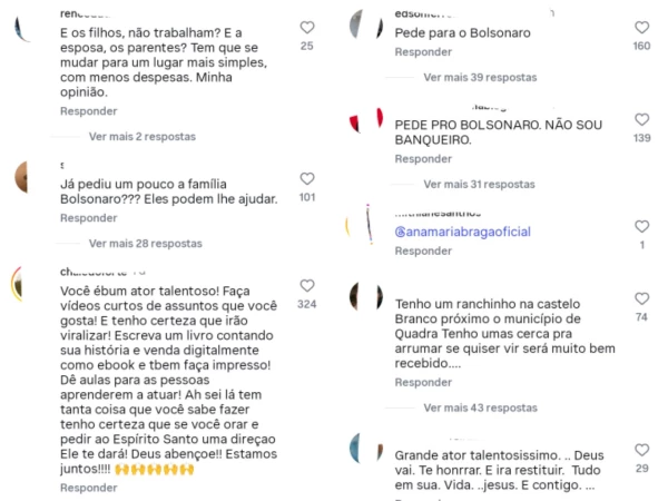Enquanto parte do público se mostrou solidária e afirmou ter contribuído financeiramente, outros internautas fizeram críticas severas ao ator. “Pede para o Bolsonaro”, escreveu um internauta, associando o pedido de ajuda de Mário Gomes ao histórico de posicionamentos políticos do artista. Houve ainda quem classificasse a atitude como uma vergonha e quem cobrasse que o ator “fosse à luta”.