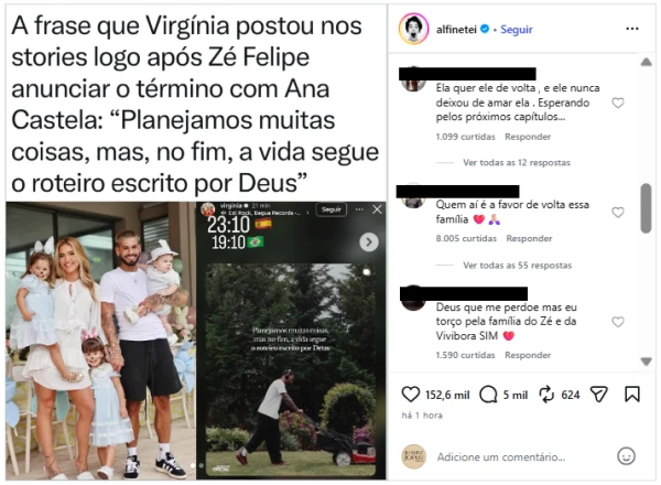 Minutos após a repercussão do anúncio, Virginia Fonseca, ex-esposa de Zé Felipe, chamou a atenção ao publicar reflexões em suas redes sociais. As postagens acabaram sendo interpretadas por parte dos internautas como possíveis indiretas, embora ela não tenha citado o cantor ou Ana Castela diretamente.