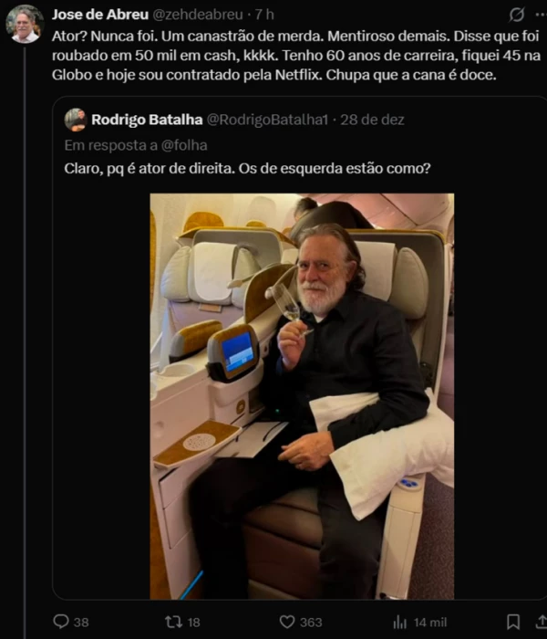 José de Abreu reagiu de forma direta ao comentário e afirmou que o colega de profissão nunca foi um ator de verdade. “Ator? Nunca foi. Um canastrão de merda. Mentiroso demais. Disse que foi roubado em 50 mil em cash, kkkk. Tenho 60 anos de carreira, fiquei 45 na Globo e hoje sou contratado pela Netflix. Chupa que a cana é doce”, disparou.