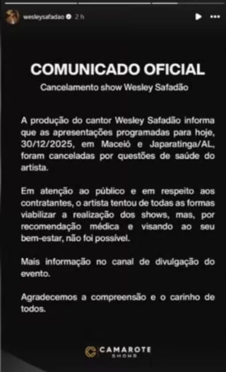 Segundo o texto divulgado no Instagram de Wesley Safadão, a prioridade foi preservar a saúde do cantor, mesmo diante do respeito ao público e aos contratantes. A recomendação dos médicos foi determinante para que os shows não fossem realizados.