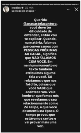 Pouco depois, Leo Dias usou seus próprios Stories para esclarecer o conteúdo da apuração. Ele explicou que a reportagem não se baseou em falas da artista, mas em informações repassadas por pessoas do convívio do casal. O colunista reforçou que, em nenhum momento, atribuiu declarações diretamente à cantora, apenas relatou acontecimentos narrados por fontes consideradas próximas e confiáveis.