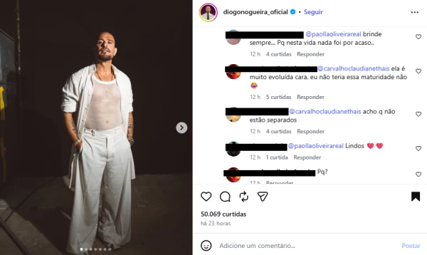 Rapidamente, muitos internautas passaram a comentar a interação de Paolla Oliveira na publicação de Diogo Nogueira. “Acho q não estão separados”, afirmou um usuário, especulando que os artistas ainda estão juntos. Muitos outros internautas ainda pediram que eles reatassem o namoro, demonstrando esperança na reconciliação.