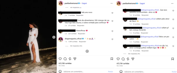 A movimentação começou quando a atriz comentou uma publicação do seu ex-namorado. Pouco tempo depois, Diogo respondeu da mesma forma em um álbum de fotos compartilhado por Paolla no Instagram, com registros da virada do ano na praia.