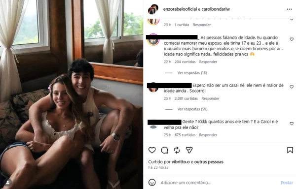 “Espero não ser um casal né, ele nem é maior de idade ainda. Socorro!”, disse um internauta. “Gente? Kkkk quantos anos ele tem ? E a Carol n é velha pra ele não?”, afirmou um outro usuário, mostrando surpresa com a diferença de idade entre Enzo Rabelo e Carol Bondariw.
