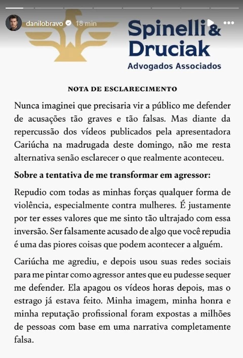 Segundo o profissional da saúde, a repercussão dos vídeos publicados por Cariúcha na madrugada de domingo o obrigou a vir a público para preservar sua imagem. Danilo declarou que jamais imaginou enfrentar acusações tão sérias e reforçou que os fatos apresentados pela apresentadora não correspondem à realidade. Ele sustenta que os acontecimentos foram distorcidos antes mesmo de ter a oportunidade de se defender.