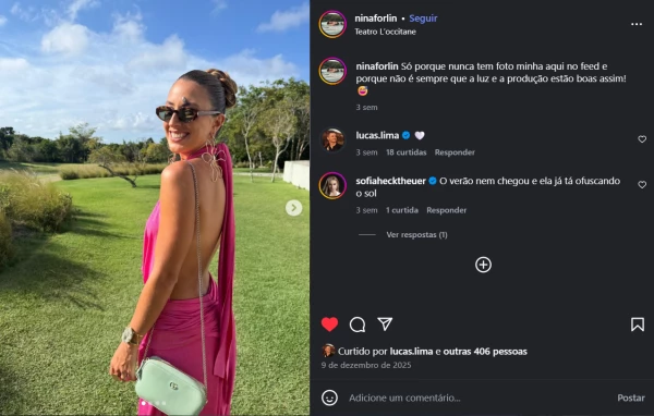 Nina Forlin já transita com naturalidade pelo ambiente artístico, unindo suas carreiras como publicitária e instrutora de yoga a um estilo de vida que se alinha perfeitamente ao de Lucas Lima. Com um perfil voltado ao universo intelectual e às artes, ela compartilha com o músico o apreço por experiências gastronômicas e viagens culturais.