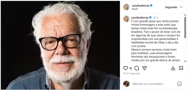 “Tive o prazer de estar com ele em algumas de suas obras e sempre fui surpreendida com sua generosidade e habilidade incrível de tratar o dia a dia com poesia”, afirmou. Carolina também declarou que Manoel Carlos sempre escreveu bons personagens para as mulheres.