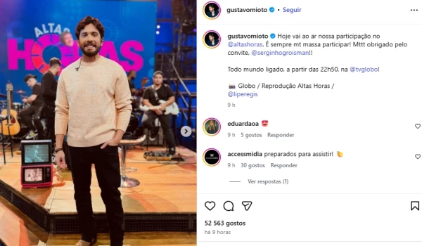 Gustavo Mioto usou o Instagram para convidar os fãs para assistirem ao programa. “Hoje vai ao ar nossa participação no Altas Horas. É sempre muito massa participar. Muito obrigado pelo convite, Serginho”, disse o cantor.
