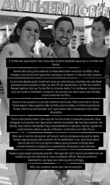 Em seu esclarecimento, o influenciador alegou que não solicitou todas as corridas mencionadas pela sogra e revelou que uma das viagens expostas foi, na verdade, pedida pela própria Camila. Ele explicou que sua ida ao Rio de Janeiro naquela ocasião ocorreu a convite da família para conhecer os parentes de Duda e ajudar nos preparativos de um churrasco familiar. Por fim, Mesquita declarou que não entende o motivo de ataques tão intensos e ressaltou que sua manifestação pública visa apenas proteger sua honra e reputação diante das acusações.