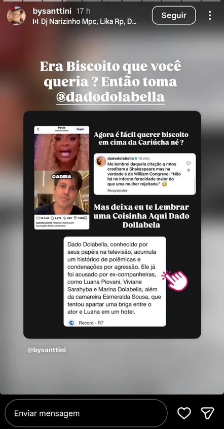 By Santtíni utilizou as legendas das publicações para criticar a postura de Dado Dolabella e o modo como ele se comunicou. Ela enfatizou que os fatos mencionados fazem parte do passado público do artista e expressou forte descontentamento com as respostas recebidas.