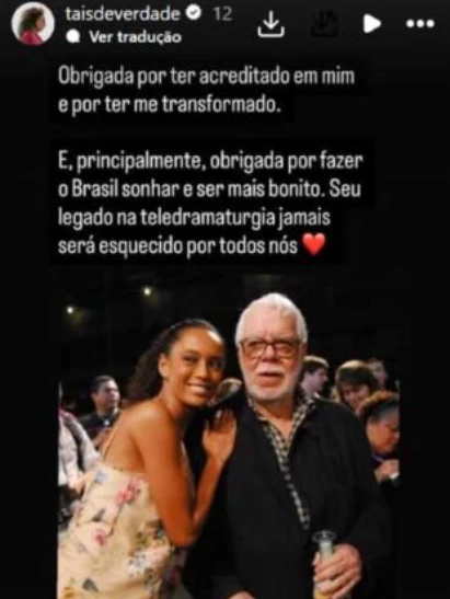 Entre as manifestações de carinho, uma das que mais repercutiram foi a da atriz Taís Araujo. A artista, que recentemente esteve à frente do remake de Vale Tudo, usou seus Stories no Instagram para se despedir do novelista e agradecer pela transformação que ele provocou em sua trajetória profissional.