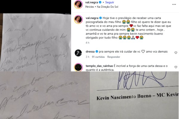 Valquíria Nascimento, mãe do cantor MC Kevin, comoveu seguidores nesta terça-feira (13) ao compartilhar nas redes sociais o recebimento de uma carta psicografada atribuída ao filho, que morreu em 2021. Em um vídeo publicado no Instagram, a empresária mostrou o conteúdo da mensagem e falou abertamente sobre a saudade que ainda sente do artista.