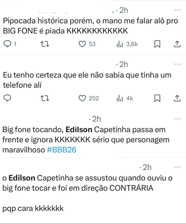 Além da tensão envolvendo os emparedados, um momento divertido chamou a atenção do público ao vivo: Edilson Capetinha protagonizou uma cena hilária enquanto o Big Fone tocava. Os telespectadores perceberam que o brother, que estava próximo ao telefone, acabou se confundindo e foi para o lado oposto, em vez de atendê-lo.