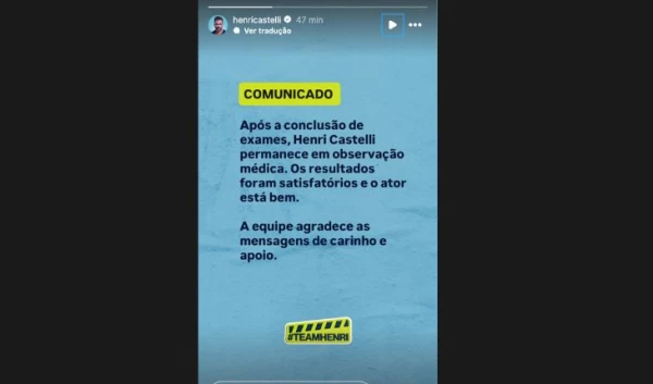 “Após a conclusão de exames, Henri Castelli permanece em observação médica. Os resultados foram satisfatórios e o ator está bem. A equipe agradece as mensagens de carinho e apoio”, disse o comunicado emitido nos stories do Instagram.