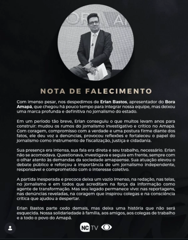 Na manhã deste sábado, 17, a emissora manifestou-se oficialmente para lamentar a perda e destacar a relevância do profissional. Em comunicado publicado nas redes sociais, a NCTV, pertencente ao Grupo Norte de Comunicação, prestou uma última homenagem ressaltando que, embora tenha integrado a equipe há pouco tempo, Erlan deixou um legado definitivo no jornalismo local.