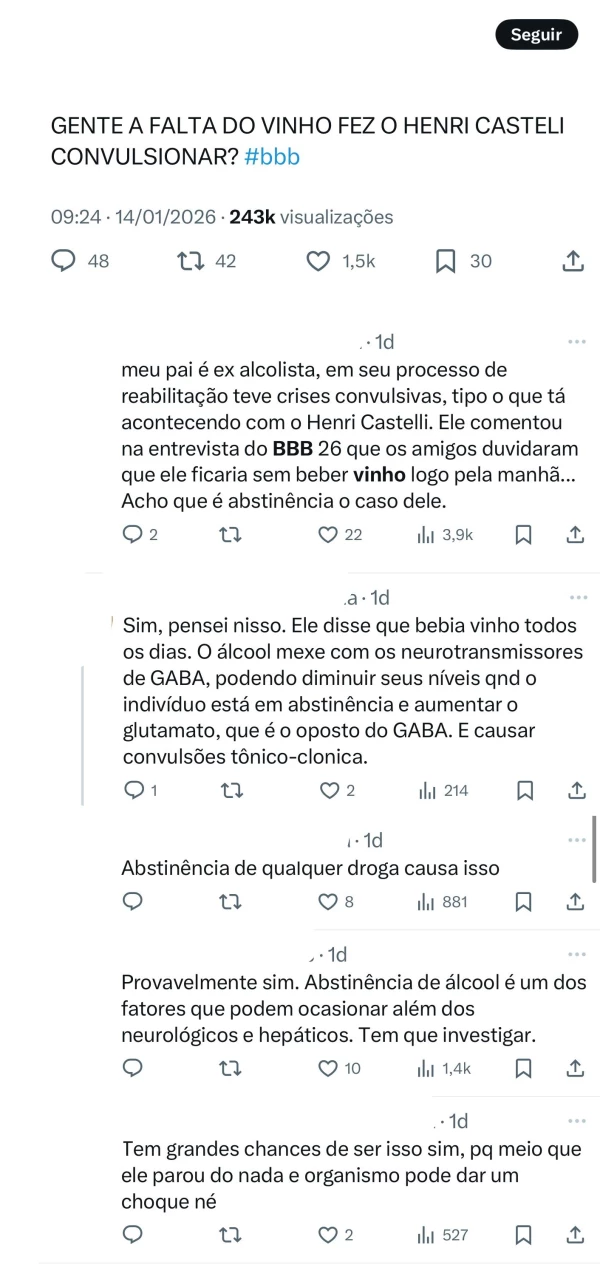 Alguns comentários dos internautas acabaram viralizando no antigo Twitter, X. Uma usuária da rede social contou um relato pessoal e afirmou que seu pai era alcoólatra e que, quando estava parando de beber no processo de reabilitação, teve crises convulsivas, assim como Henri Castelli. Outro ainda disse que o álcool mexe com os neurotransmissores, podendo diminuir os níveis em pessoas que estão em abstinência, causando convulsões. “Abstinência de qualquer droga causa isso”, disse uma internauta.