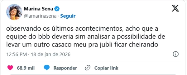 Com bom humor, Marina ironizou a saudade e os momentos de tensão vividos por Juliano no confinamento, incluindo seu choro. Em seu perfil no X (antigo Twitter), a cantora sugeriu de forma descontraída que a produção do programa avaliasse levar outro casaco seu para o brother, como uma forma simbólica de ajudá-lo a se acalmar diante dos episódios estressantes dentro da casa.