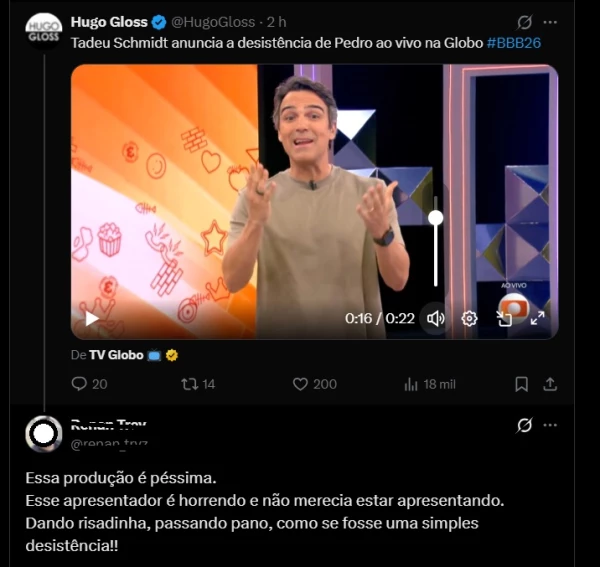 A desistência de Pedro do BBB26 foi anunciada oficialmente por Tadeu Schmidt em uma entrada ao vivo na programação da Globo, mas a postura do apresentador acabou gerando forte repercussão negativa nas redes sociais. O momento, que já era delicado devido às polêmicas envolvendo o ex-participante, ganhou ainda mais destaque por causa do tom adotado durante o comunicado.