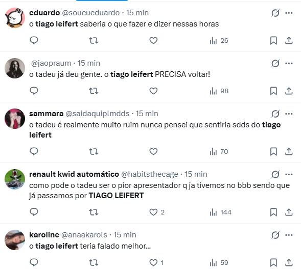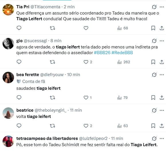 Outro comentário que ganhou força nas redes destacou a comparação direta entre os dois comunicadores: “O Tadeu é muito despreparado pra esse programa, gente. Se fosse na época do Tiago Leifert seria muito diferente”, escreveu um usuário. A saudade do antigo apresentador ficou evidente, principalmente pela forma como Tiago costumava tratar temas delicados no reality.