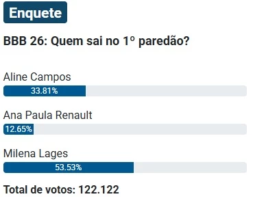 De acordo com a enquete do portal Notícias da TV, que já ultrapassou a marca de 122 mil votos, o cenário aponta vantagem para a saída de Milena Lages. A participante do grupo Pipoca foi indicada diretamente ao paredão pelo líder da semana, Alberto Cowboy, e acabou se tornando um dos principais alvos do público logo na primeira semana do reality show da Globo.