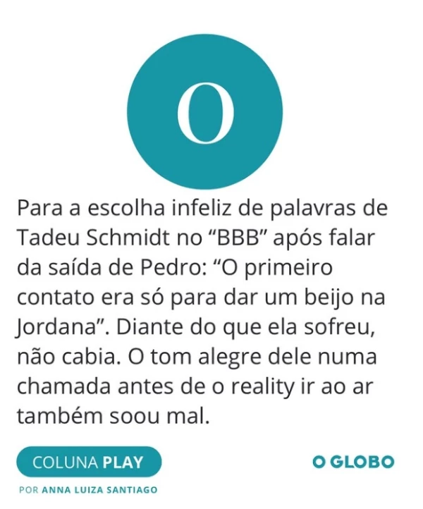 Segundo a colunista, o modo como Tadeu se referiu ao primeiro contato entre Pedro e Jordana não foi apropriado diante da gravidade da situação. Para ela, o contexto exigia mais cautela e sensibilidade, especialmente considerando o desconforto vivido pela participante. Além disso, o tom adotado pelo apresentador em uma chamada antes da exibição do reality também foi visto como destoante do ocorrido.