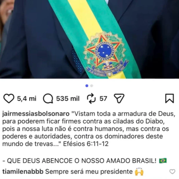 Um comentário antigo feito por Milena antes de entrar no BBB26 veio à tona nas redes sociais e tem provocado debates intensos fora da casa. Internautas resgataram uma interação da participante em uma publicação de Jair Bolsonaro, datada de 2022, na qual ela escreveu “Sempre será meu presidente”.