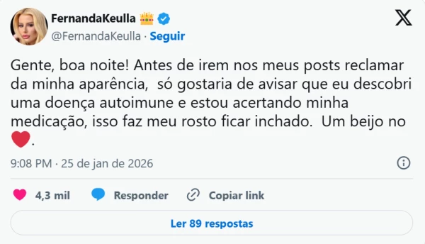 “Gente, boa noite! Antes de irem nos meus posts reclamar da minha aparência, só gostaria de avisar que eu descobri uma doença autoimune e estou acertando minha medicação, isso faz meu rosto ficar inchado. Um beijo no coração”, declarou a loira.