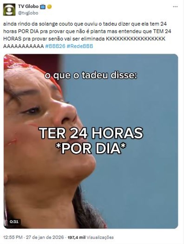 “Ainda rindo da Solange Couto que ouviu o Tadeu dizer que ela tem 24 horas POR DIA pra provar que não é planta, mas entendeu que TEM 24 HORAS pra provar senão vai ser eliminada”, disse a emissora, em seu perfil oficial no X.