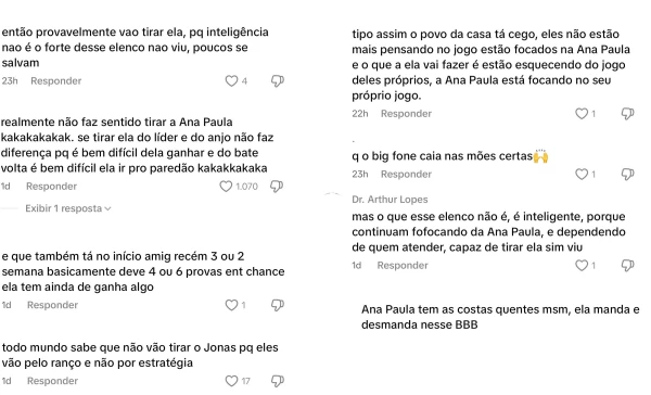 Ela teria dito que, se tivesse o veto do Líder e Babu o usasse para bloquear Jonas, ele provavelmente pediria para sair, já que essa seria a única forma de se destacar. O TikToker brincou que a veterana, mesmo considerada “péssima” nas dinâmicas, parecia ter influenciado a direção do reality.