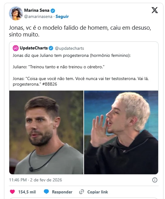 Ela compartilhou um trecho da confusão no X e escreveu: “Jonas, você é o modelo falido de homem, caiu em desuso, sinto muito”. No vídeo publicado, Juliano acusa Jonas de não usar o cérebro, enquanto o modelo tenta rebater, mencionando hormônios femininos.