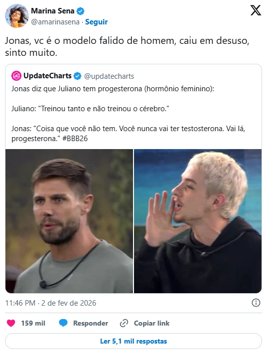 A manifestação aconteceu no X, antigo Twitter, após a circulação de um trecho da discussão. No diálogo, Juliano teria ironizado o influenciador ao sugerir que ele treinava apenas o corpo, e não o cérebro. Jonas rebateu com comentários envolvendo testosterona e chegou a usar o termo progesterona de forma provocativa. Diante disso, Marina saiu em defesa do companheiro: “Jonas, você é o modelo falido de homem, caiu em desuso. Sinto muito”.