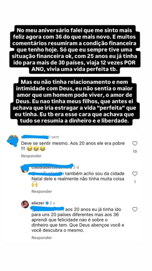 “Mas eu não tinha relacionamento e nem intimidade com Deus. Eu não sentia o maior amor que um homem pode viver, o amor de Deus. Eu não tinha meus filhos, que antes eu achava que iriam estragar a vida ‘perfeita’ que eu tinha”, declarou. Ele ainda rebateu críticas específicas de internautas que o chamaram de pobre no passado para justificar sua satisfação presente.
