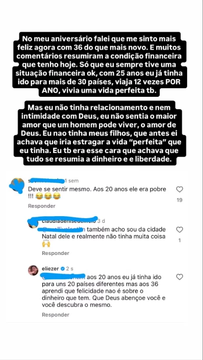 “No meu aniversário falei que me sinto mais feliz agora com 36 do que mais novo. Muitos comentários resumiram isso à condição financeira que tenho hoje. Só que eu sempre tive uma situação financeira ok. Com 25 anos, eu já tinha ido para mais de 30 países, viajava 12 vezes por ano, vivia uma vida ‘perfeita’ também”, escreveu.