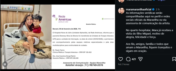 “As informações verídicas serão compartilhadas aqui no perfil e redes sociais oficiais da Maravilha ou via assessoria de comunicação da artista. No quarto hospitalar, Mara já recebeu a visita do filho Miguel, motivo de alegria, felicidade e força”, dizia a postagem feita nas redes sociais.