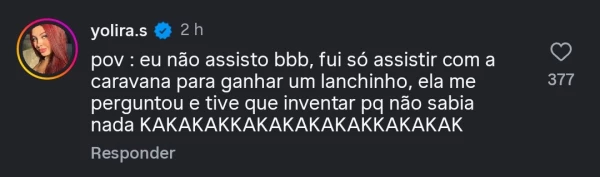 Uma das falas exibidas gerou repercussão nas redes sociais ao elogiar a postura de Sarah no jogo. “Com certeza para a Sarah porque, assim, o jogo dela é bom, ela está seguindo a mesma linha de raciocínio do mesmo ano. Eu acho que ela vai ganhar”, disse uma das pessoas entrevistadas.