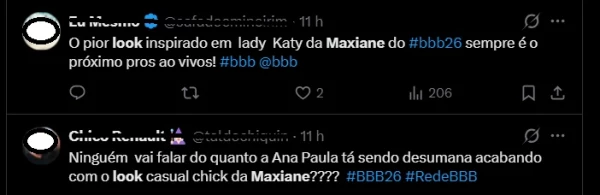 Apesar da intenção, o look rapidamente virou alvo de comentários críticos no Instagram e em outras plataformas. Internautas avaliaram que a escolha não combinava com o ambiente da prova e consideraram a produção exagerada. Muitos telespectadores afirmaram em tom de deboche que o visual parecia distante da proposta casual do reality e acabou soando cafona.