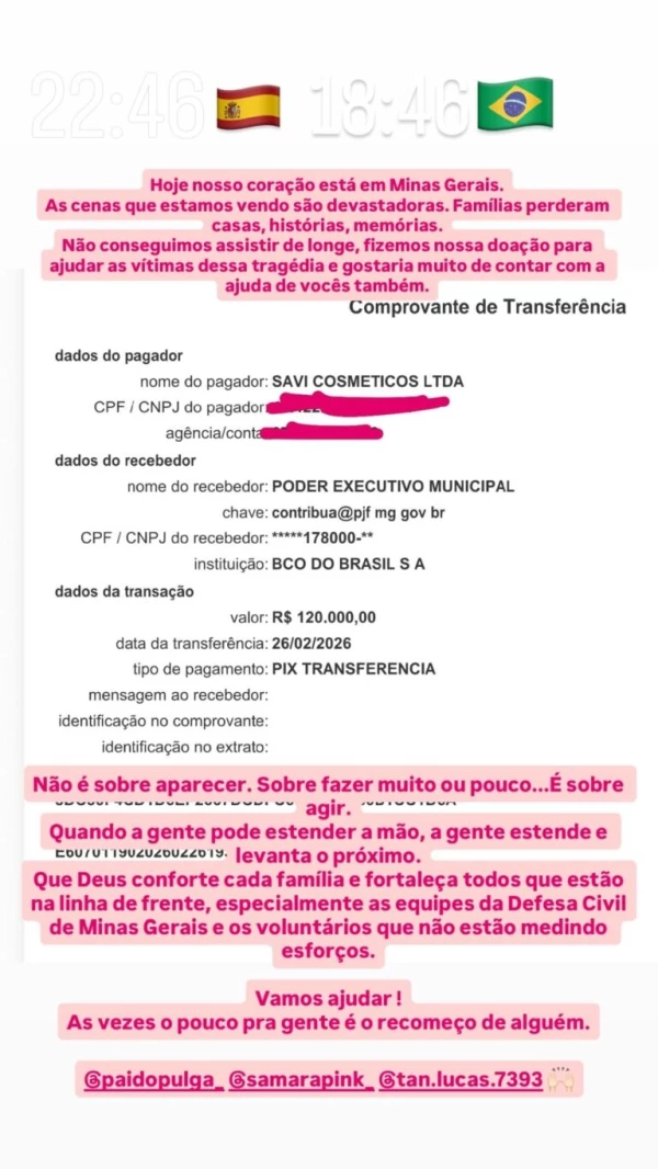 A criadora de conteúdo publicou nos Stories o comprovante de uma doação no valor de R$ 120 mil destinada ao Poder Executivo Municipal, com o objetivo de colaborar com as famílias afetadas pelos alagamentos e deslizamentos registrados nos últimos dias.