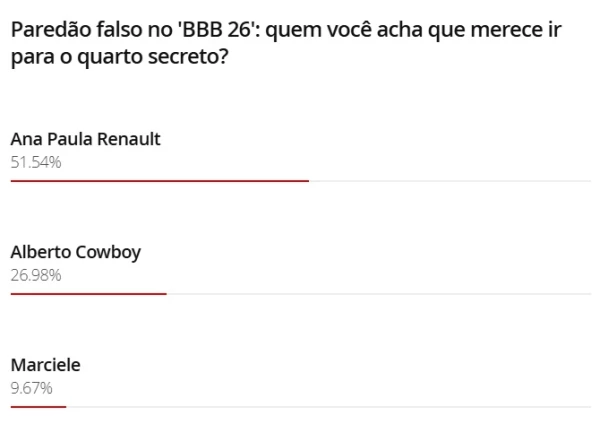 É importante destacar que a enquete do EXTRA não possui caráter oficial. A votação válida acontece exclusivamente no site do programa, no Gshow. A pesquisa funciona apenas como termômetro das torcidas e pode ajudar fãs a direcionarem seus votos na disputa real.
