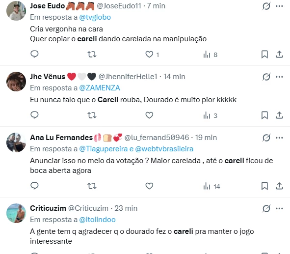 Nas redes, a acusação de manipulação dominou o debate: “Quer copiar o Carelli dando carelada na manipulação”, escreveu um usuário; outro disparou: “O Dourado é igual o Carelli, manipulação escancarada”. Houve ainda quem ironizasse a decisão da produção: “Chamaram o Carelli pra dirigir o BBB”, enquanto um comentário resumiu o sentimento de surpresa: “Anunciar isso no meio da votação? Maior carelada”. As reações mostram que parte do público vê semelhanças na postura dos dois diretores e questiona a transparência das mudanças durante o jogo.