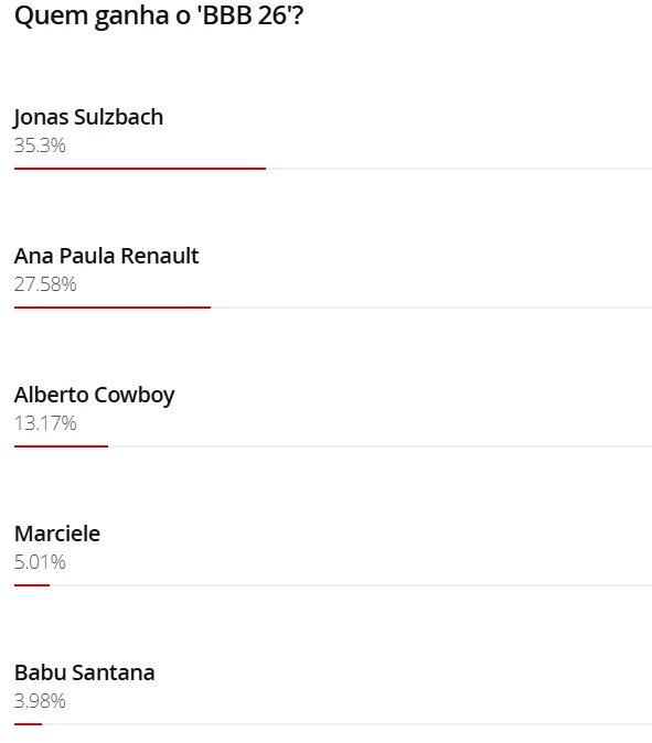 Na última enquete sobre o favorito da edição, Ana Paula Renault deixou de ocupar o posto de favorita. De acordo com a parcial atualizada, Jonas Sulzbach assumiu a liderança com 35,3% dos votos. Ana Paula aparece agora em segundo lugar, com 27,58%, enquanto Alberto Cowboy soma 13,17%. Marciele registra 5,01% e Babu Santana fecha o top 5 com 3,98%, mostrando um cenário mais fragmentado na disputa.