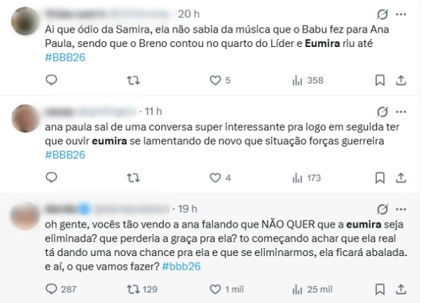 “Ana Paula sai de uma conversa super interessante para logo em seguida ter que ouvir Eumira se lamentando de novo. Que situação. Forças, guerreira”, escreveu uma internauta. O Eumira tem o sentido de que Samira só pensa em si mesma e em mais ninguém.